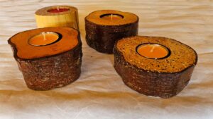 Diese Holz-Teelichter werden aus Ästen in die entsprechende Größe gesägt, gelocht, mit Glitzer versehen und lackiert. Sie sind mit Alufolie im Loch versehen und beinhalten außerdem einen Teelichthalter aus Blech, wahlweise Edelstahl, sodass ein sicheres Herunterbrennen der Teelichter gegeben ist. Sie sind individuell gearbeitet und sorgen für eine behagliche Gemütlichkeit.